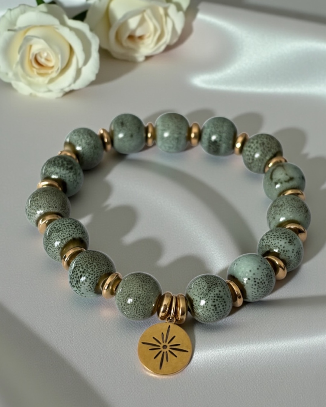 Composé de perles en céramique de 10 mm aux nuances vertes délicates et subtilement mouchetées, ce bracelet évoque la douceur apaisante des pierres naturelles et des paysages végétaux.